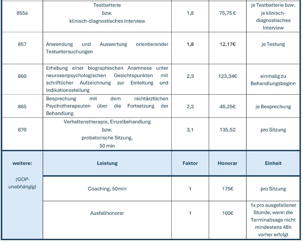 Abgerechnet wird nach der Gebührenordnung für Psychotherapeut:innen (GOP). Eine Übersicht über die am häufigsten verwendeten Ziffern und Leistungen, sehen Sie in der unten stehenden Tabelle.